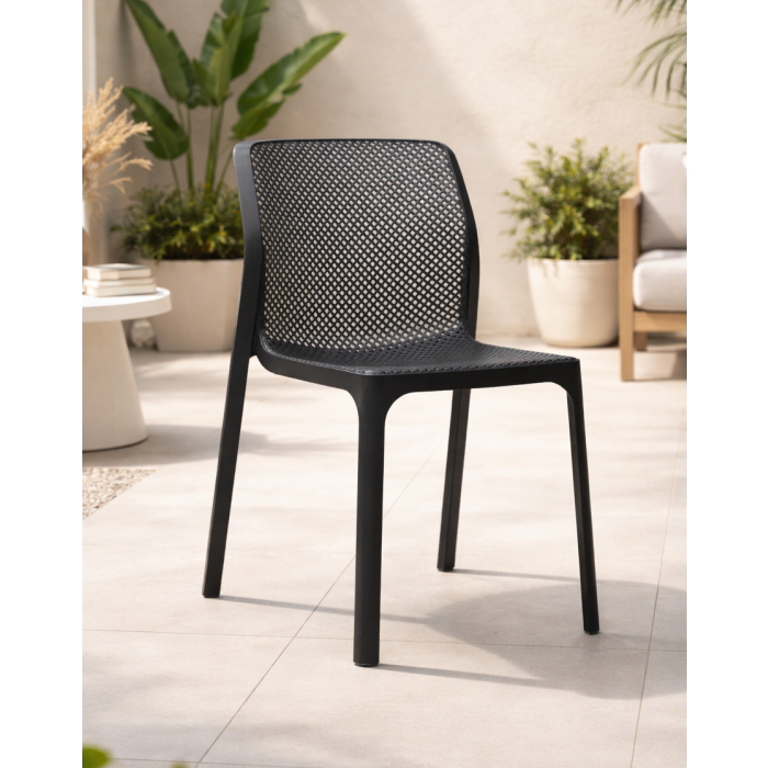 Sedia monoblocco senza braccioli da esterno BIT di Nardi®, realizzata in polipropilene fiberglass trattato anti‑UV color antracite e colorata in massa con finitura opaca; il design raffinato e la cura del dettaglio si esprimono nel motivo traforato, che rende BIT versatile e adatta a diversi contesti sia esterni sia interni; dimensioni 52×55 h. 84 cm con altezza seduta 47 cm, peso 3,5 kg, impilabile, dotata di piedini antiscivolo, testata a norma e fornita montata.