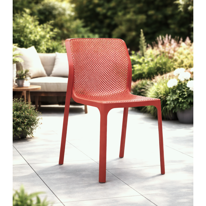 Sedia monoblocco senza braccioli da esterno BIT di Nardi®, realizzata in polipropilene fiberglass trattato anti‑UV color corallo e colorata in massa con finitura opaca; il design raffinato e la cura del dettaglio si esprimono nel motivo traforato, che rende BIT versatile e adatta a diversi contesti sia esterni sia interni; dimensioni 52×55 h. 84 cm con altezza seduta 47 cm, peso 3,5 kg, impilabile, dotata di piedini antiscivolo, testata a norma e fornita montata.