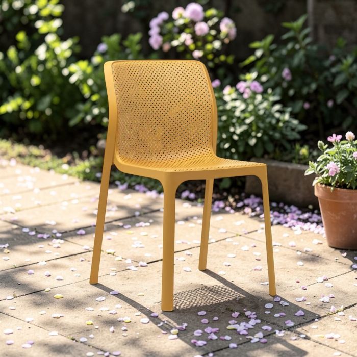 Sedia monoblocco senza braccioli da esterno BIT di Nardi®, realizzata in polipropilene fiberglass trattato anti‑UV color senape e colorata in massa con finitura opaca; il design raffinato e la cura del dettaglio si esprimono nel motivo traforato, che rende BIT versatile e adatta a diversi contesti sia esterni sia interni; dimensioni 52×55 h. 84 cm con altezza seduta 47 cm, peso 3,5 kg, impilabile, dotata di piedini antiscivolo, testata a norma e fornita montata.