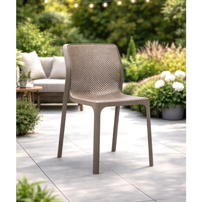 Sedia monoblocco senza braccioli da esterno BIT di Nardi®, realizzata in polipropilene fiberglass trattato anti‑UV color tortora e colorata in massa con finitura opaca; il design raffinato e la cura del dettaglio si esprimono nel motivo traforato, che rende BIT versatile e adatta a diversi contesti sia esterni sia interni; dimensioni 52×55 h. 84 cm con altezza seduta 47 cm, peso 3,5 kg, impilabile, dotata di piedini antiscivolo, testata a norma e fornita montata.