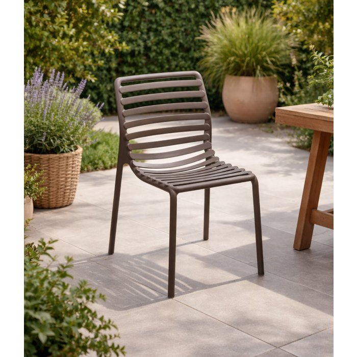 Sedia monoblocco senza braccioli DOGA BISTROT di Nardi®, reinterpretazione in chiave contemporanea del tema della doga pensata per uso esterno, realizzata in polipropilene fiberglass trattato anti‑UV colore tabacco con finitura opaca, maneggevole, impilabile, facilmente igienizzabile e completamente riciclabile; dimensioni 53×55 h. 82,5 cm con altezza seduta 47,5 cm, peso 4,1 kg, dotata di piedini antiscivolo, testata a norma da Catas e fornita montata.