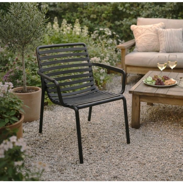 Poltrona monoblocco da esterno DOGA RELAX di Nardi®, realizzata in polipropilene fiberglass trattato anti‑UV colore antracite con finitura opaca, caratterizzata da una struttura ampia e ribassata pensata per il relax all’aperto, definita da un elegante gioco di pieni e vuoti creato dalla sequenza di doghe orizzontali, facilmente igienizzabile e riciclabile; dimensioni 70,5×75 h. 77 cm con altezza seduta 41,5 cm e altezza braccioli 58 cm, peso 6 kg, impilabile, dotata di piedini antiscivolo, testata a norma da Catas e fornita montata.