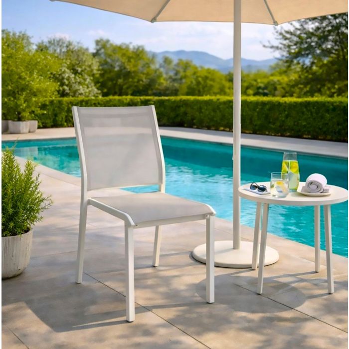 La sedia da esterno mod. ESSENTIA è realizzata con struttura in alluminio colore bianco e seduta e schienale in textilene grigio chiaro, è impilabile, misura 46 x 61 x 88 cm con altezza seduta 45 cm e viene fornita montata, offrendo una soluzione elegante, leggera e resistente per giardini, terrazze e ambienti contract.
