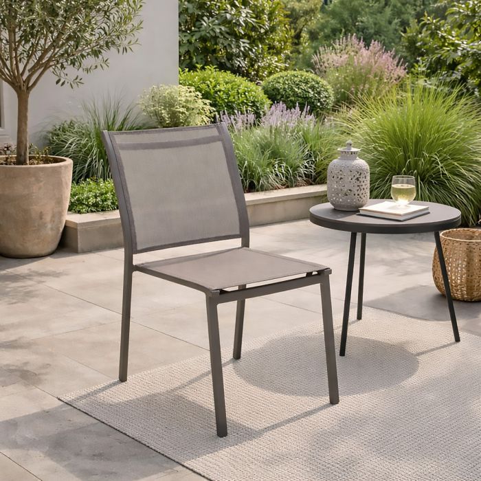 La sedia da esterno mod. ESSENTIA è realizzata con struttura in alluminio colore marrone e seduta e schienale in textilene marrone, è impilabile, misura 46 x 61 x 88 cm con altezza seduta 45 cm e viene fornita montata, offrendo una soluzione elegante, leggera e resistente per giardini, terrazze e ambienti contract.