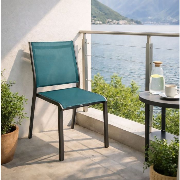 La sedia da esterno mod. ESSENTIA è realizzata con struttura in alluminio colore antracite e seduta e schienale in textilene colore ottanio, è impilabile, misura 46 x 61 x 88 cm con altezza seduta 45 cm e viene fornita montata, offrendo una soluzione elegante, leggera e resistente per giardini, terrazze e ambienti contract.