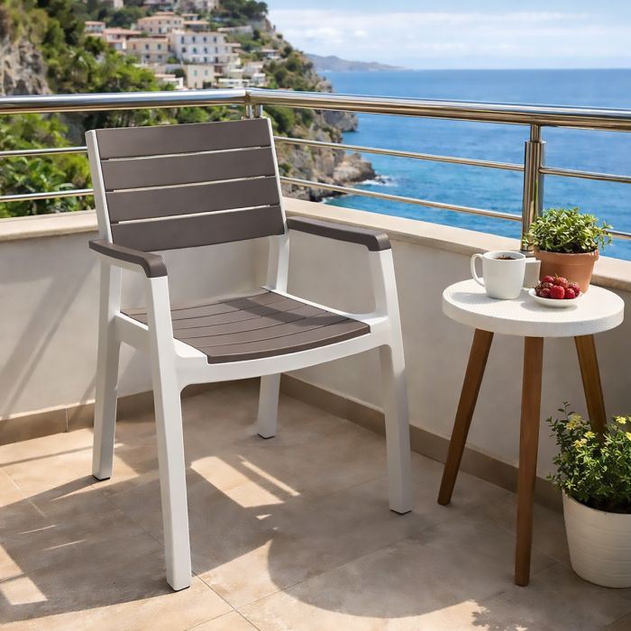 La sedia da esterno mod. HARMONY, realizzata in resina colore bianco, misura 59 x 60 x 86 cm, è dotata di braccioli e presenta seduta, schienale e braccioli in colore antracite; è impilabile e viene fornita già montata, offrendo una soluzione elegante, resistente e di facile manutenzione per l’arredo esterno.