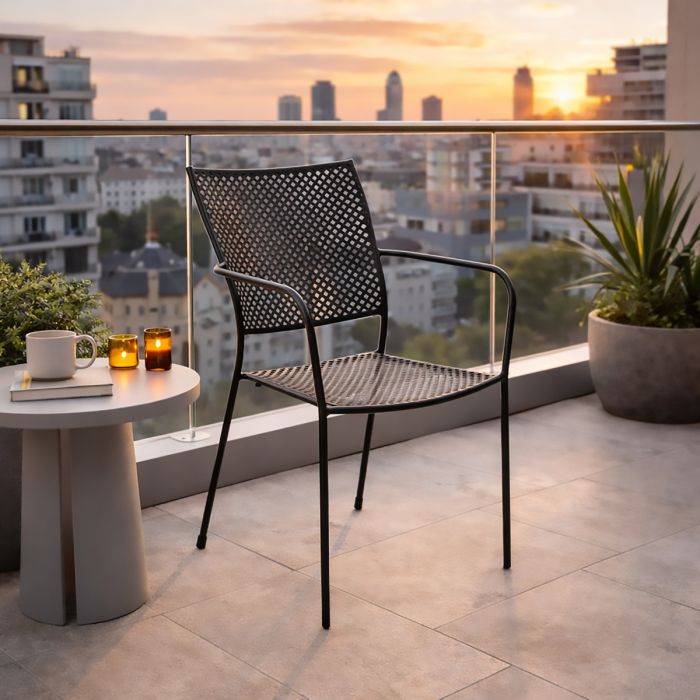 Sedia mod. MILADY dal design sobrio e resistente, con struttura in ferro verniciato con polveri epossidiche colore nero, dotata di braccioli e impilabile per ottimizzare gli spazi; misura complessiva 57 x 47 x h. 89 cm, altezza seduta 45 cm; il prodotto viene fornito montato, ideale per contesti contract e residenziali che richiedono robustezza e praticità.