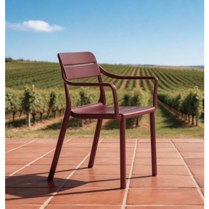 Sedia monoblocco con braccioli CASSIA ARMCHAIR di Nardi®, realizzata in polipropilene fiberglass trattato anti‑UV colore borgogna con finitura opaca, presenta una seduta a doghe orizzontali stilizzate che assicura massimo comfort e versatilità e misure contenute progettate per valorizzare i piccoli spazi; dimensioni 59×57 h. 81,5 cm con altezza seduta 45,5 cm e altezza braccioli 65 cm, peso 4,2 kg, impilabile, dotata di piedini antiscivolo, testata a norma da Catas e fornita montata.