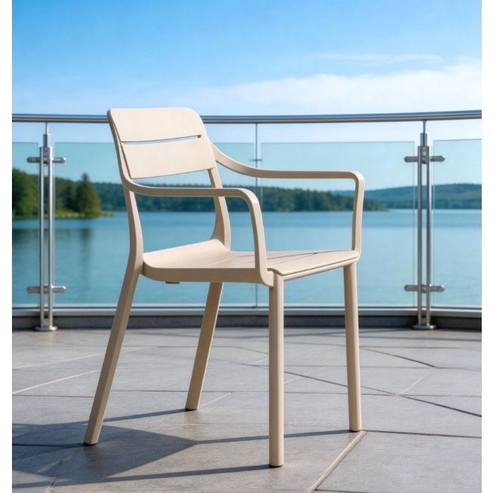 Sedia monoblocco con braccioli CASSIA ARMCHAIR di Nardi®, realizzata in polipropilene fiberglass trattato anti‑UV colore corda con finitura opaca, presenta una seduta a doghe orizzontali stilizzate che assicura massimo comfort e versatilità e misure contenute progettate per valorizzare i piccoli spazi; dimensioni 59×57 h. 81,5 cm con altezza seduta 45,5 cm e altezza braccioli 65 cm, peso 4,2 kg, impilabile, dotata di piedini antiscivolo, testata a norma da Catas e fornita montata.