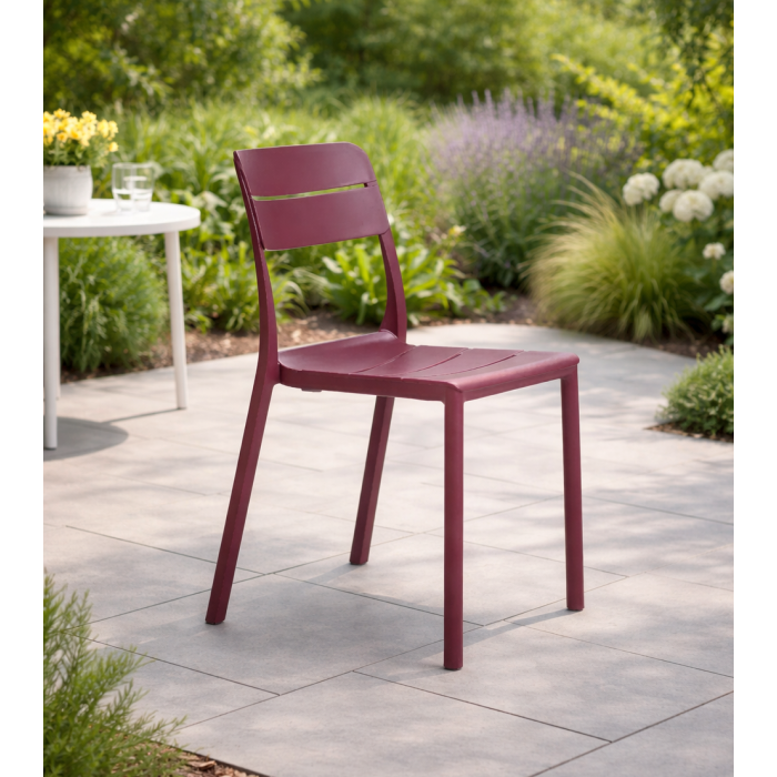 Sedia monoblocco senza braccioli CASSIA BISTROT di Nardi®, realizzata in polipropilene fiberglass trattato anti‑UV colore borgogna con finitura opaca, seduta ergonomica a doghe orizzontali stilizzate che garantisce massimo comfort e versatilità anche in spazi contenuti; dimensioni 49×50,5 h. 81,5 cm con altezza seduta 46 cm, peso 3,7 kg, impilabile, dotata di piedini antiscivolo, testata a norma da Catas e fornita montata per un utilizzo immediato.