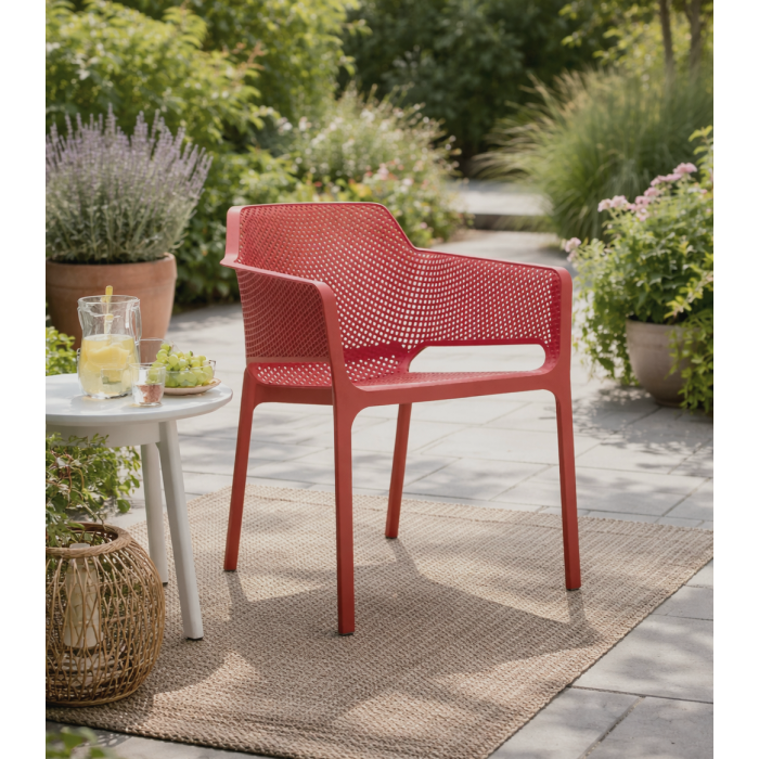 Sedia/poltrona da esterno NET di Nardi®, realizzata in polipropilene fiberglass trattato anti‑UV colore corallo con finitura opaca, caratterizzata da una monoscocca accuratamente traforata con un motivo di fori quadrati e raggiati che si distribuiscono in continuità sulla superficie tridimensionale, offrendo un raffinato comfort di seduta; dimensioni 60,5×58,5 h. 80 cm con altezza seduta 46,5 cm e altezza braccioli 69 cm, peso 3,9 kg, impilabile, dotata di piedini antiscivolo, testata a norma da Catas e fornita montata.