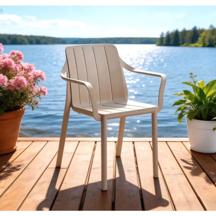 Sedia monoblocco con braccioli TRILL ARMCHAIR di Nardi®, realizzata in polipropilene fiberglass trattato anti‑UV colore Corda con finitura opaca, caratterizzata da un’anima green e da linee arrotondate che richiamano l’estetica delle sedute dogate con gambe circolari; dimensioni 59×55,5 h. 81 cm con altezza seduta 46 cm e altezza braccioli 65 cm, peso 5 kg, impilabile, dotata di piedini antiscivolo, testata a norma da Catas e fornita montata.