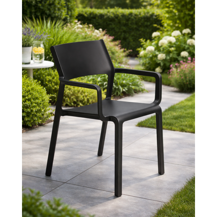 Sedia monoblocco con braccioli TRILL ARMCHAIR di Nardi®, pensata per uso esterno e realizzata in polipropilene fiberglass trattato anti‑UV colore antracite con finitura opaca, seduta con braccioli dall’aspetto armoniosamente scultoreo espressa da un design senza tempo; dimensioni 58,5×53,5 h. 82,5 cm con altezza seduta 47,5 cm e altezza braccioli 64,5 cm, peso 4,7 kg, impilabile, dotata di piedini antiscivolo, testata a norma da Catas e fornita montata.