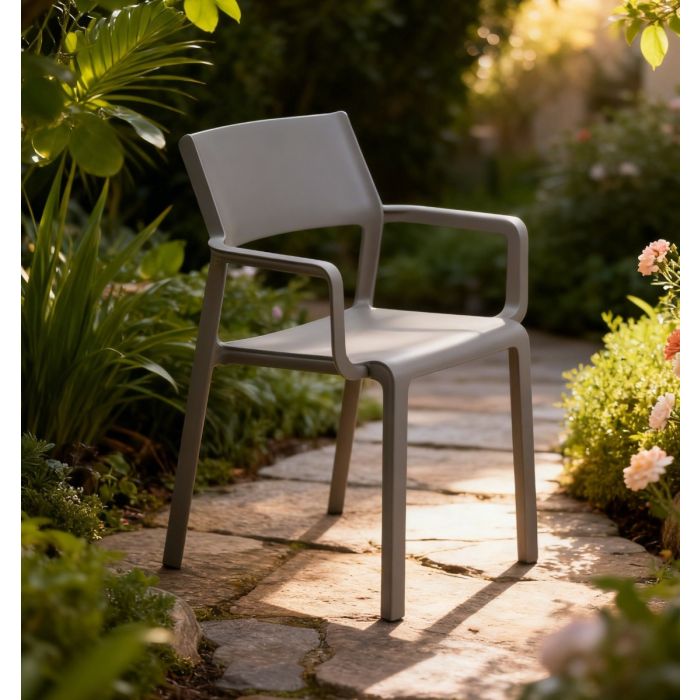 Sedia monoblocco con braccioli TRILL ARMCHAIR di Nardi®, pensata per uso esterno e realizzata in polipropilene fiberglass trattato anti‑UV colore tortora con finitura opaca, seduta con braccioli dall’aspetto armoniosamente scultoreo espressa da un design senza tempo; dimensioni 58,5×53,5 h. 82,5 cm con altezza seduta 47,5 cm e altezza braccioli 64,5 cm, peso 4,7 kg, impilabile, dotata di piedini antiscivolo, testata a norma da Catas e fornita montata.