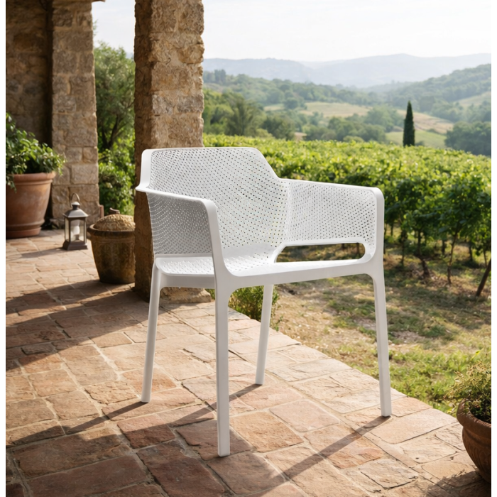 Sedia/poltrona da esterno NET di Nardi®, realizzata in polipropilene fiberglass trattato anti‑UV colore bianco con finitura opaca, caratterizzata da una monoscocca accuratamente traforata con un motivo di fori quadrati e raggiati che si distribuiscono in continuità sulla superficie tridimensionale, offrendo un raffinato comfort di seduta; dimensioni 60,5×58,5 h. 80 cm con altezza seduta 46,5 cm e altezza braccioli 69 cm, peso 3,9 kg, impilabile, dotata di piedini antiscivolo, testata a norma da Catas e fornita montata.