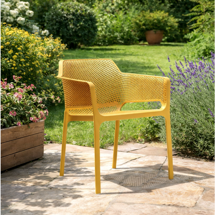 Sedia/poltrona da esterno NET di Nardi®, realizzata in polipropilene fiberglass trattato anti‑UV colore senape con finitura opaca, caratterizzata da una monoscocca accuratamente traforata con un motivo di fori quadrati e raggiati che si distribuiscono in continuità sulla superficie tridimensionale, offrendo un raffinato comfort di seduta; dimensioni 60,5×58,5 h. 80 cm con altezza seduta 46,5 cm e altezza braccioli 69 cm, peso 3,9 kg, impilabile, dotata di piedini antiscivolo, testata a norma da Catas e fornita montata.