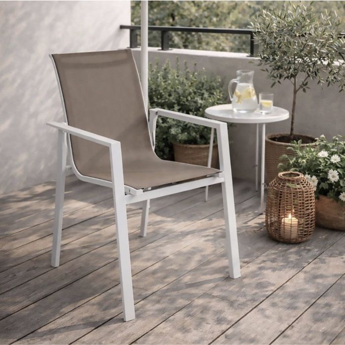 Sedia mod. PAVANE dal design elegante e funzionale, con struttura in alluminio colore bianco, seduta e schienale in textilene colore beige, dotata di braccioli e impilabile per ottimizzare gli spazi; misura complessiva 56 x 62 x h. 90 cm, ideale per uso indoor e outdoor grazie alla leggerezza e resistenza dei materiali.