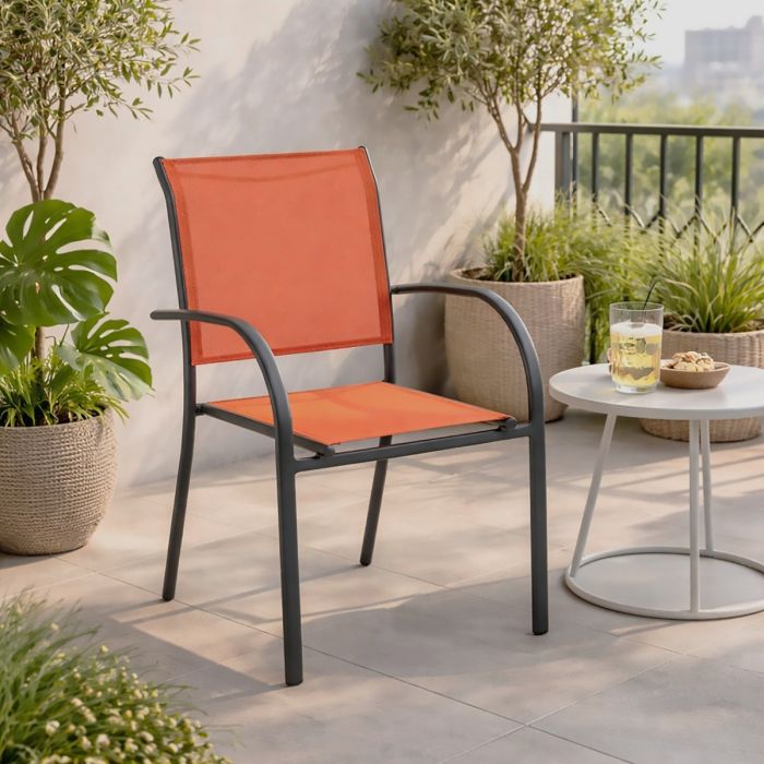 La sedia da esterno mod. PIAZZA è realizzata in alluminio colore antracite con schienale e seduta in textilene ambra, è impilabile, dotata di braccioli, misura 56 x 65 x 87 cm, la seduta misura 40 x 46 cm con altezza seduta 45 cm e altezza braccioli 65 cm, viene fornita montata e rappresenta una soluzione elegante, resistente e salvaspazio per balconi, terrazze e ambienti contract.
