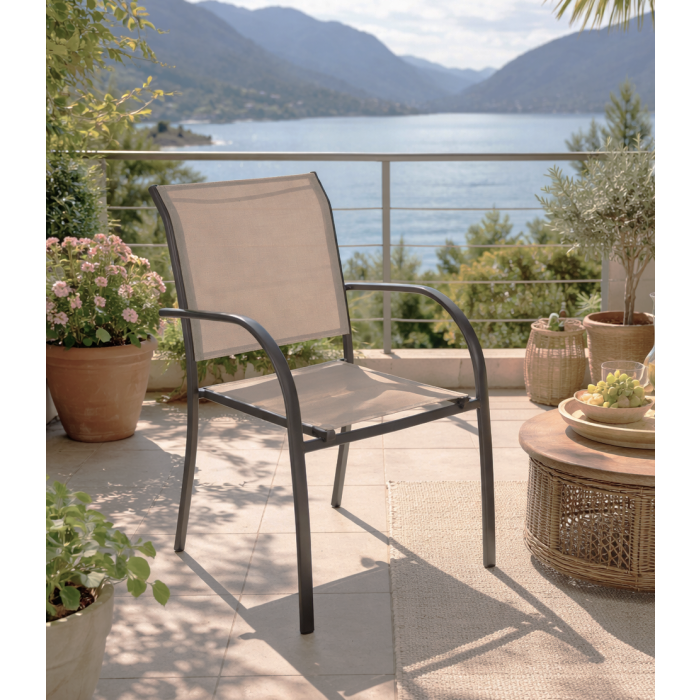 Sedia mod. PIAZZA dal design contemporaneo e funzionale, con struttura in alluminio colore antracite, seduta e schienale in textilene colore tortora, impilabile per ottimizzare gli spazi e dotata di braccioli per maggiore comfort; dimensioni complessive 56 x 65 x h. 87 cm, altezza seduta 45 cm, altezza braccioli 65 cm, misura seduta 40 x 46 cm; il prodotto viene fornito montato, ideale per ambienti contract e residenziali che richiedono leggerezza, resistenza e un’estetica sobria.