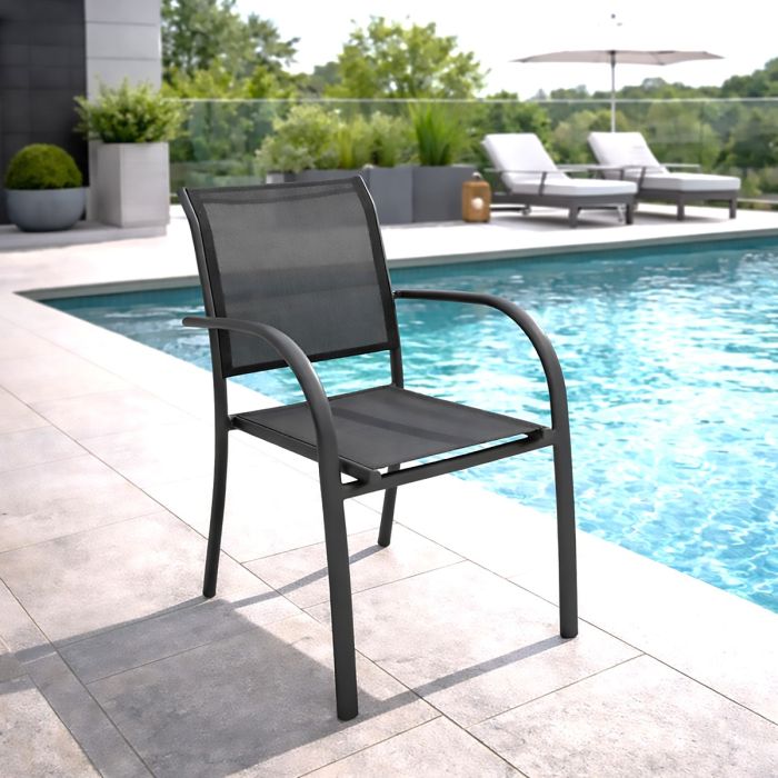 La sedia da esterno mod. PIAZZA è realizzata in alluminio colore grafite con schienale e seduta in textilene antracite, è impilabile, dotata di braccioli, misura 56 x 65 x 87 cm, la seduta misura 40 x 46 cm con altezza seduta 45 cm e altezza braccioli 65 cm, viene fornita montata e rappresenta una soluzione elegante, resistente e salvaspazio per balconi, terrazze e ambienti contract.