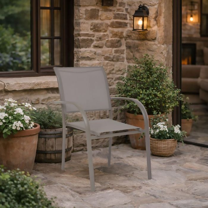 La sedia da esterno mod. PIAZZA è realizzata in alluminio colore caffè con schienale e seduta in textilene caffè, è impilabile, dotata di braccioli, misura 56 x 65 x 87 cm, la seduta misura 40 x 46 cm con altezza seduta 45 cm e altezza braccioli 65 cm, viene fornita montata e rappresenta una soluzione elegante, resistente e salvaspazio per balconi, terrazze e ambienti contract.