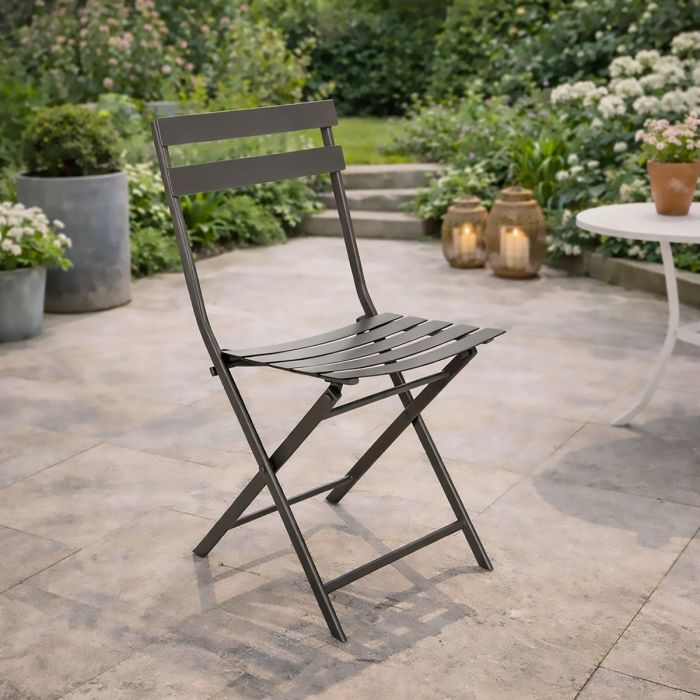 La sedia da esterno mod. GREENSBORO è realizzata con struttura in acciaio colore tonka, è pieghevole, misura 51 x 42 x 80 cm con altezza seduta 42 cm e viene fornita montata, offrendo una soluzione pratica, compatta e resistente ideale per balconi, terrazze e ambienti contract.