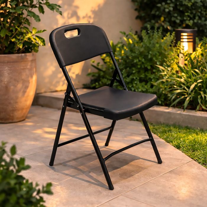 Sedia da esterno pieghevole con struttura in acciaio colore antracite, seduta e schienale in resina colore grigio, dimensioni 45 x 59 x h. 79,5 cm e altezza seduta 45 cm; leggera, robusta e salvaspazio grazie al meccanismo pieghevole, ideale per terrazze, giardini e spazi esterni che richiedono praticità e facilità di stoccaggio.
