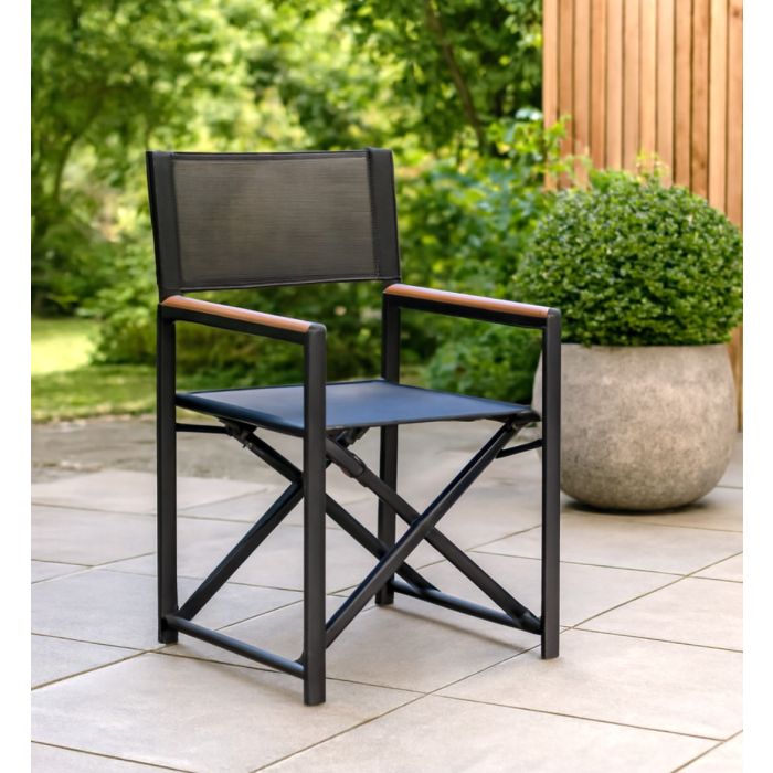Sedia da regista con struttura in alluminio verniciato a polvere colore antracite, seduta in textilene, particolari braccioli in PVC effetto legno naturale, dimensioni 56×48×h.86 cm, pieghevole per facile trasporto e stoccaggio; design leggero, robusto e confortevole, ideale per uso interno ed esterno, pronta all’uso poiché fornita montata.