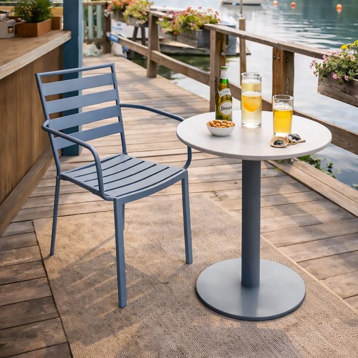 La sedia da esterno mod. SANTORINI EVO con struttura in acciaio verniciato a polvere colore carta da zucchero è impilabile e dotata di braccioli per un utilizzo confortevole; misura 51×53 × h 90 cm e viene fornita montata, soluzione elegante e pratica per arredi esterni contemporanei.