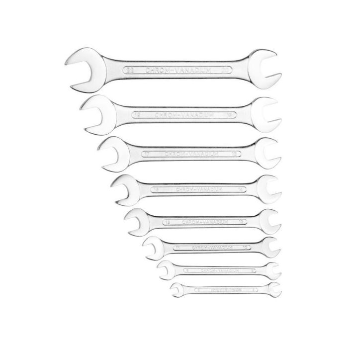Set di 8 chiavi fisse conformi alle norme DIN 3110, realizzate in resistente acciaio cromo‑vanadio e fornite in pratico contenitore in plastica, con misure 6×7, 8×9, 10×11, 12×13, 14×15, 16×17, 18×19 e 20×22 mm, ideale per interventi di serraggio precisi in ambito professionale e hobbistico.