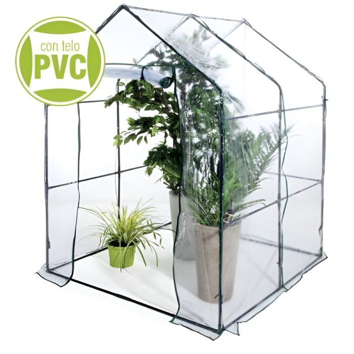 Serra a casetta di grandi dimensioni, senza ripiani. Struttura in metallo verniciato, parti di raccordo in materiale plastico. Apertura frontale con cerniera. Fornita completa di picchetti di fissaggio al terreno. Telo PVC trasparente.