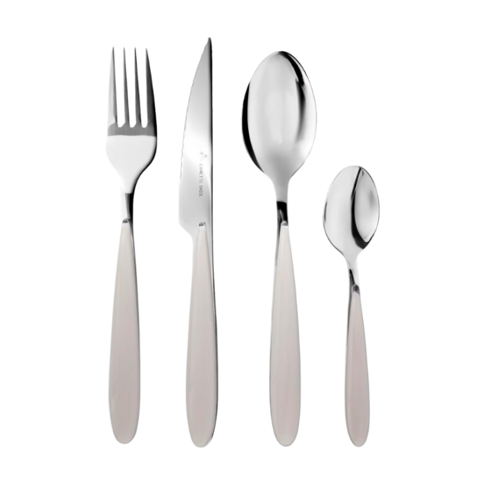 - 6 Forchette - 6 Cucchiai - 6 Cucchiaini - 6 Coltelli - Posate realizzate con lama in acciaio inox 18/C e manico ergonomico in ABS bianco - Lavabile in lavastoviglie |