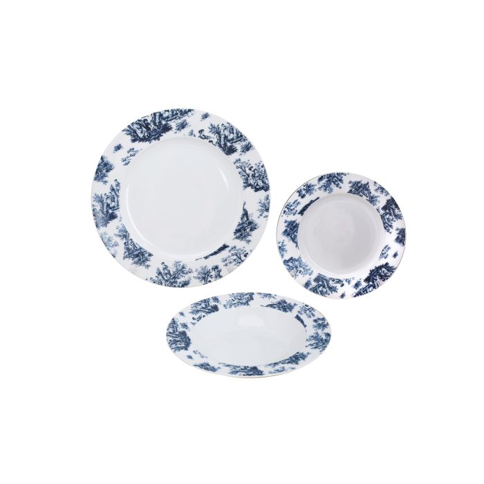 Il design di INGLESE è caratterizzato da un motivo dettagliato e intricato in tonalità blu su sfondo bianco, che decora l’ala dei piatti piani e l’intera superficie dei piatti fondi e frutta. Queste illustrazioni, che richiamano scene di vita campestre o paesaggi idilliaci, conferiscono al servizio un’aura di eleganza classica e una ricchezza visiva. Il cuore dei piatti piani rimane bianco, offrendo uno sfondo pulito per le tue creazioni culinarie, mentre i bordi sono rifiniti da un sottile profilo scuro che aggiunge un tocco di raffinatezza. Questo servizio è ideale per pranzi eleganti, cene formali o per infondere un’atmosfera di charme senza tempo nella tua casa.