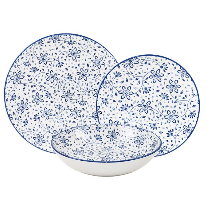 Servizio piatti 18pz SIRMIONE BLU in porcellana con decoro "Pad Printing" di eleganti fiori blu su sfondo bianco; set composto da 6 piatti piani Ø 26 cm, 6 piatti fondo Ø 20 cm e 6 piatti frutta Ø 19 cm, confezionato in scatola litografata con finestrella, lavabile in lavastoviglie e adatto all’uso in microonde, perfetto per tavole raffinate e per un utilizzo quotidiano pratico e sicuro.