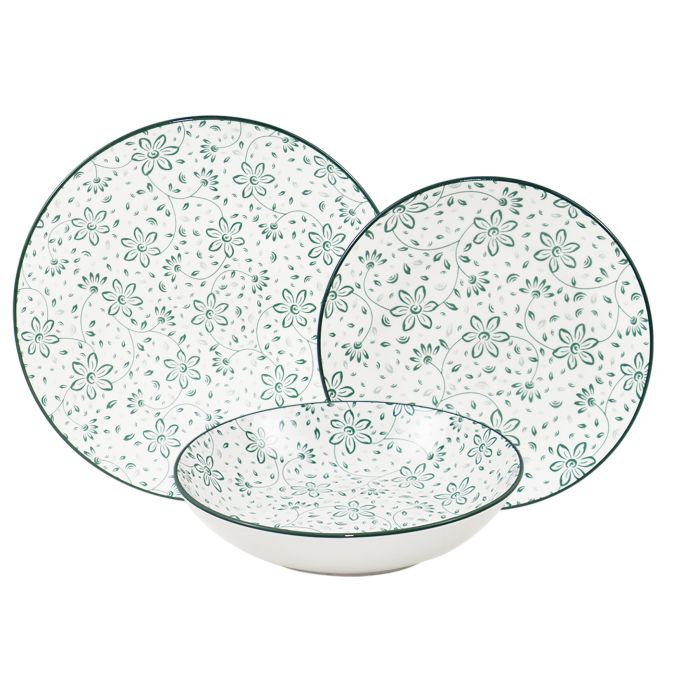 Servizio piatti 18pz SIRMIONE VERDE in porcellana con decoro "Pad Printing" di raffinati fiori verdi su sfondo bianco: motivo floreale stilizzato con petali e foglioline dai contorni nitidi e dettagli sottili che donano un aspetto elegante e contemporaneo; composto da 6 piatti piani Ø 26 cm, 6 piatti fondo Ø 20 cm e 6 piatti frutta Ø 19 cm, confezionato in scatola litografata con finestrella, lavabile in lavastoviglie e adatto all’uso in microonde, perfetto per impreziosire la tavola quotidiana o per occasioni speciali.