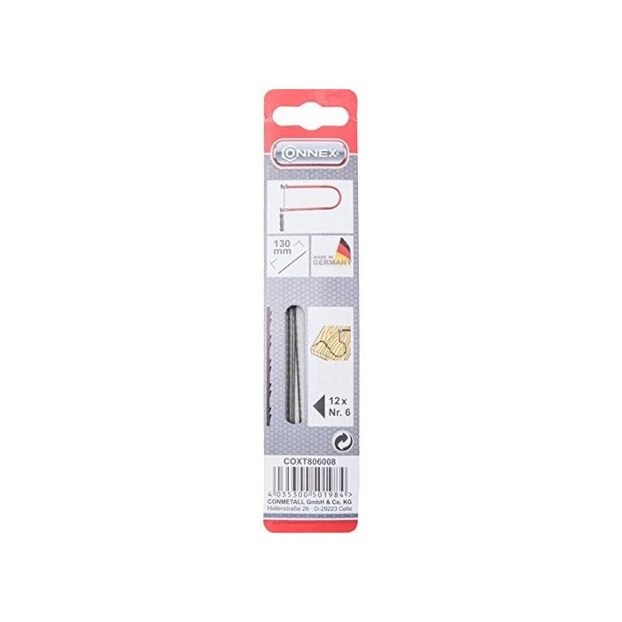 Set di 12 lame di ricambio TAIFUN per traforo, lunghezza 130 mm, misura n° 6, ideali per il taglio preciso del legno; realizzate per garantire scorrevolezza, controllo e durata, rappresentano una soluzione affidabile per lavori artigianali, hobbistici e di modellismo.
