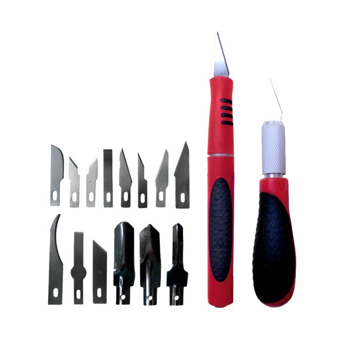 Set da 16 pezzi per il taglio della balsa composto da 2 coltelli universali con manico bimateriale e 14 lame assortite, ideale per modellismo e lavori di precisione; dotato di sistema di sostituzione lama rapido e intuitivo, è fornito in un pratico box di plastica appendibile, perfetto per mantenere ordine e avere sempre gli utensili a portata di mano.
