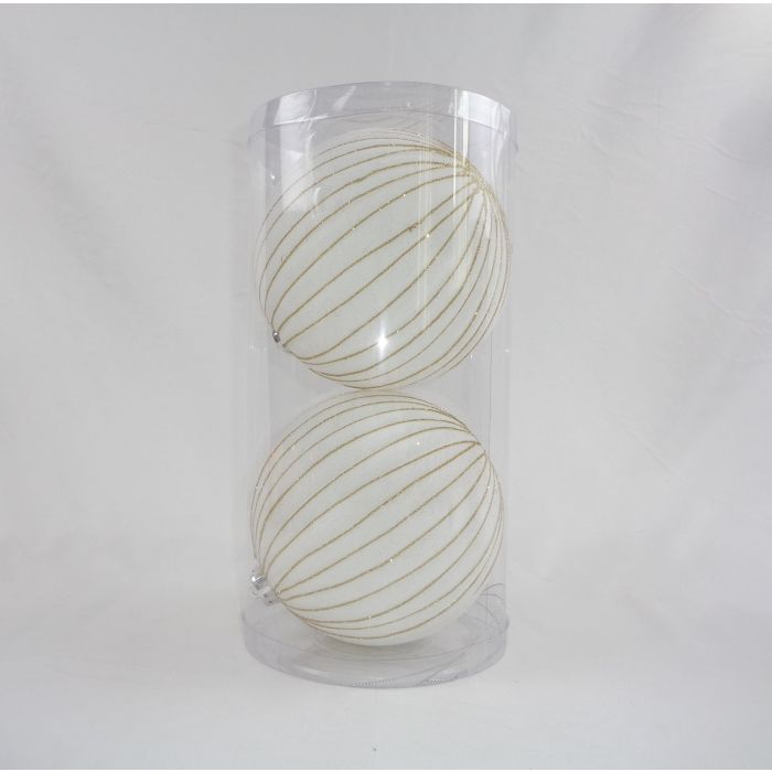| Note | - Confezione con 2 palline in plastica - Superficie floccata bianca con decoro glitterato oro - Con laccetto per appenderle - Perfette per impreziosire l'albero natalizio |