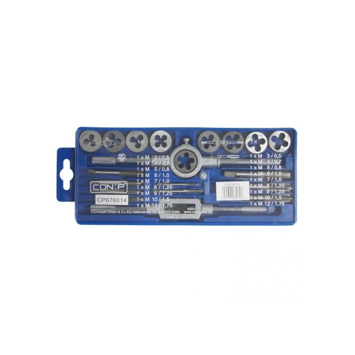 | Note | - Maschi M3 M4 M5 M6 M7 M8 M9 M10 M12; - Filiere Ø 25 x 9 mm: M3 M4 M5 M6 M7 M8 M9 M10 M12; - Giramaschi M 3 M12; - Portafiliere 25x9mm; - In pratico box plastica per tenere tutto in perfetto ordine |