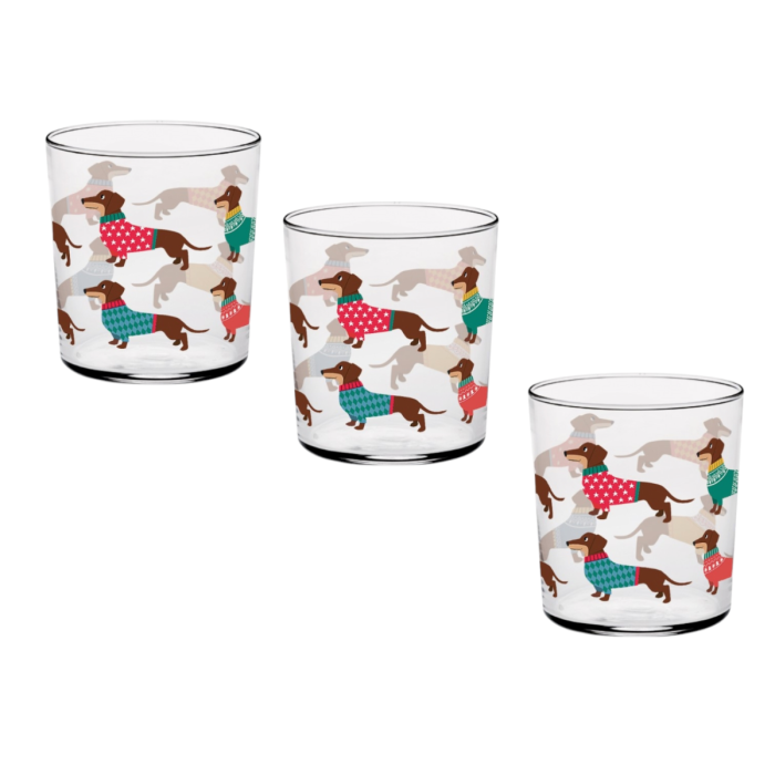 | Note | - Confezione con 3 bicchieri da acqua in vetro trasparente con decoro bassotto