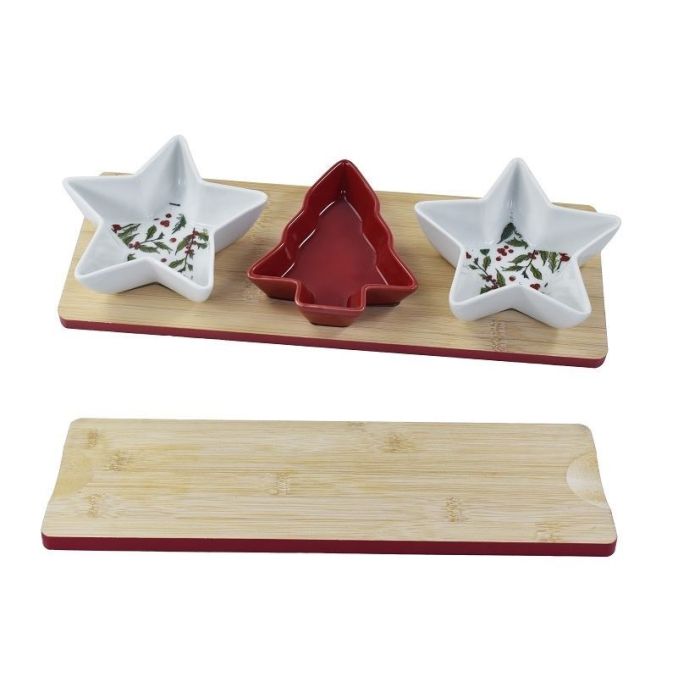 | Note | - Set 3 ciotole in ceramica: - 2 a forma di stella bianche con decoro natalizio interno -1 a forma di albero di natale rosso - Con vassoio in legno naturale - Ottimo da portare in tavola con snack e stuzzichini - Ciotole lavabili in lavastoviglie - Vassoio lavabile con acqua e sapone e asciugarlo rapidamente - Non metterlo in lavastoviglie e non lasciarlo in ammollo |