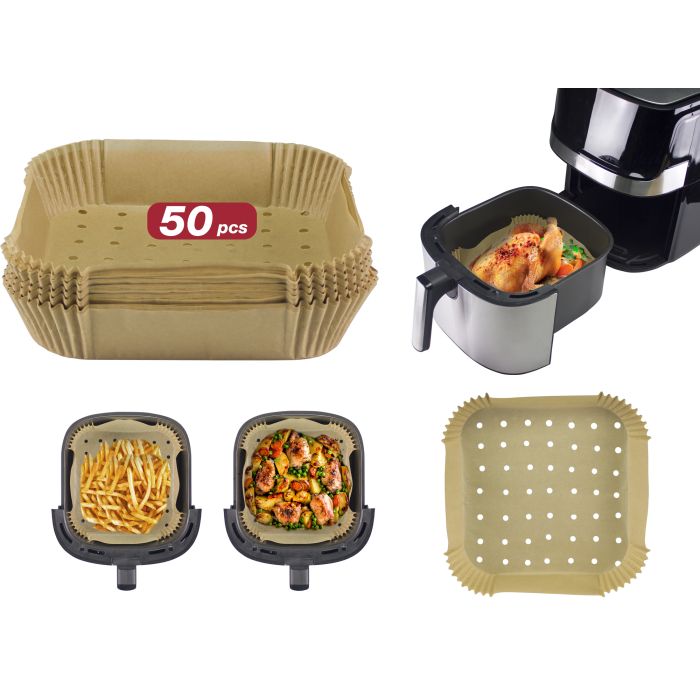 Note | - Confezione di 50 vassoi in carta forno; - Ideali per friggitrici ad aria calda da 5 a 10 litri; - La base forata consente all’aria di circolare agevolmente per una cottura uniforme; - Ideali per disporre ed estrarre comodamente le pietanze; - Limitano lo sporco; - Antiaderenti, oleorepellenti, impermeabili e biodegradabili; - Utlizzabili anche nei forni tradizionali e in vaporiere |