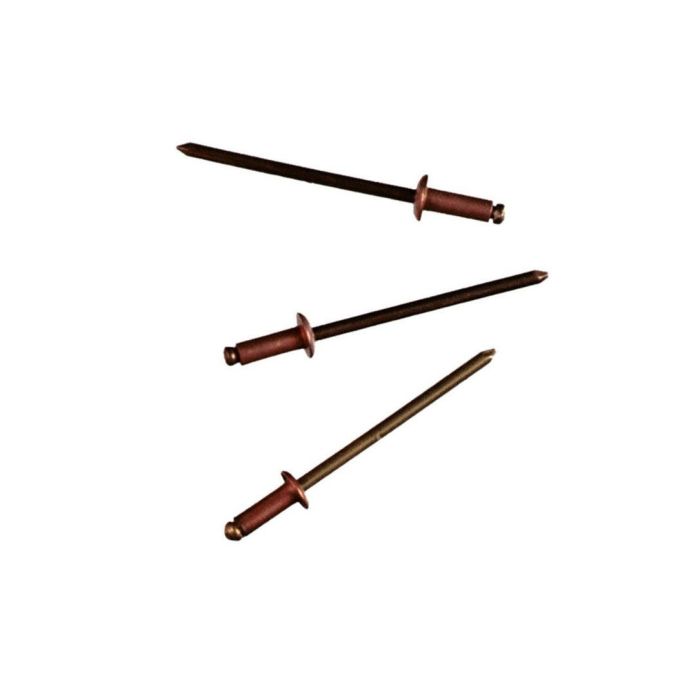 Rivetti ciechi, realizzati in rame. Utilizzati per unire saldamente due o più elementi, senza necessità di accesso su entrambi i lati, ideali per situazioni in cui è possibile accedere solo a un lato della giunzione.