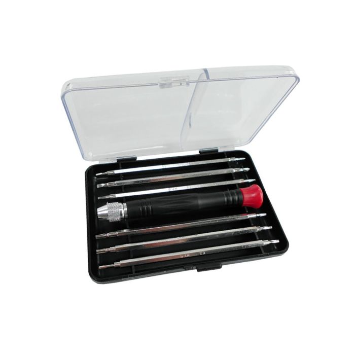 Set di 6 giraviti di precisione con lame intercambiabili in acciaio cromo‑vanadio, lunghezza 110 mm, dotati di finale magnetico, impugnatura ergonomica in plastica e terminale girevole per avvitamenti precisi; fornito in un pratico box in plastica, include punte Phillips (PH00, PH0), taglio (1,5 mm, 2,5 mm), esagonali (1,5 mm, 2,0 mm) e Torx (TX4, TX5, TX6, TX7, TX8, TX10), ideale per lavori di precisione, elettronica e modellismo.