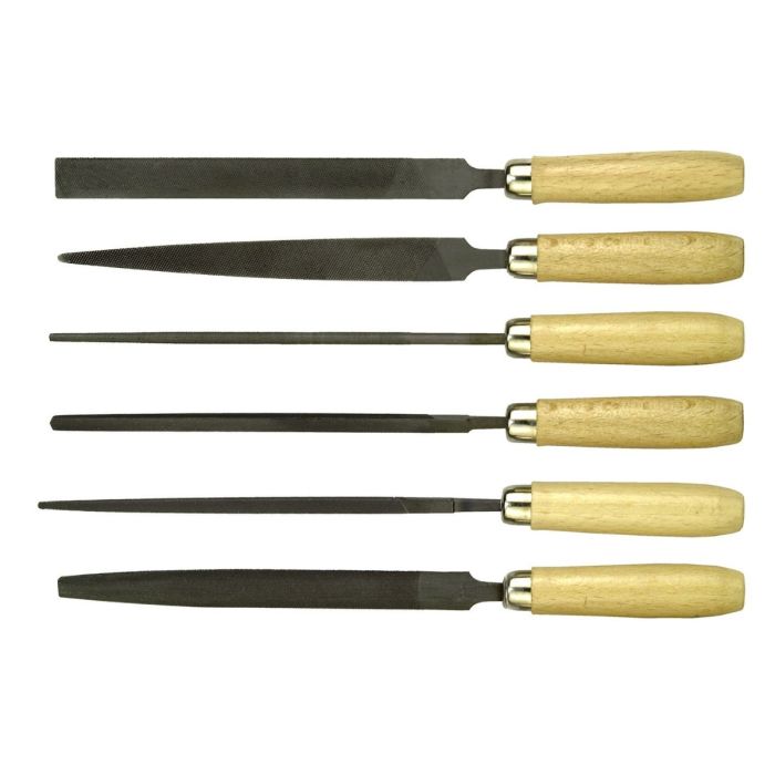 Set di 6 lime assortite con manico in legno: comprende 1 mezzatonda; 1 quadrangolare; 1 triangolare; 1 tonda; 1 punta aguzza piatta; 1 punta smussata piatta, progettate per lavori di rifinitura e modellatura su legno, metallo e plastica; impugnatura ergonomica in legno per presa salda e controllo preciso, ideali per officina, hobbistica e riparazioni.