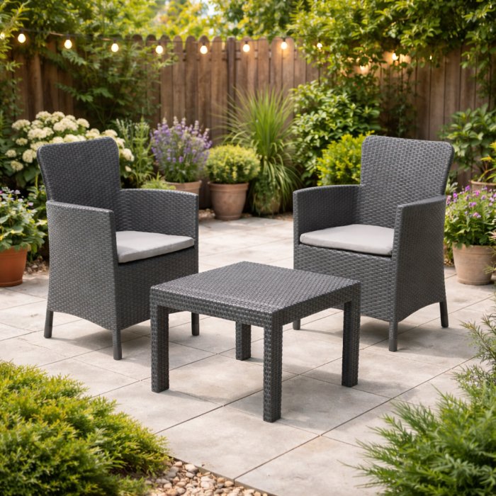 Salotto da giardino modello SALVADOR con struttura in resina antracite e scocca con finitura intrecciata effetto rattan, completo di 2 poltrone 62×60×h.89 cm e 1 tavolino 59×59×h.43 cm, dotato di cuscini in policotone grigio sfoderabili per facile manutenzione; design elegante e resistente agli agenti atmosferici, leggero, pratico da spostare e fornito smontato per un trasporto agevole.