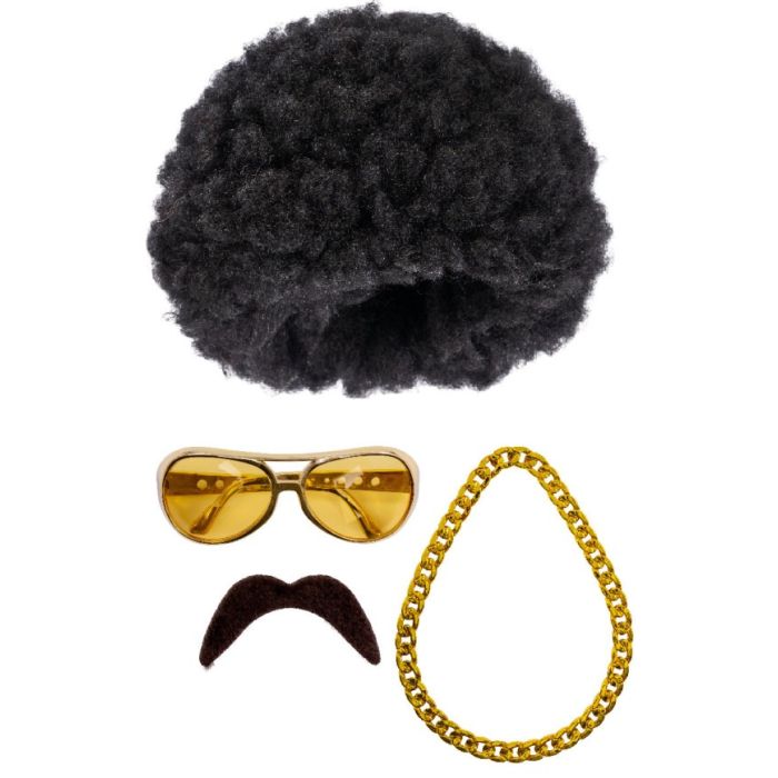 COMPRENDE: - Parrucca e baffi in poliestere neri - Occhiali in plastica ambrati - Collana in plastica dorata effetto catena - Accessori ideali per interpretare il classico uomo anni '70 in feste a tema, compleanni, rappresentazioni o travestimenti di carnevale |