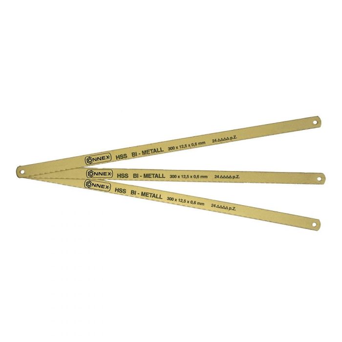 Set da 3 lame di ricambio HSS bimetalliche per seghetto X3, realizzate in bi‑metallo ad alta resistenza, dimensioni 300×12,5×0,6 mm; progettate per garantire tagli precisi e duraturi su metallo e materiali misti, resistenti all’usura e facili da montare per sostituzioni rapide durante lavori di officina, edilizia e fai‑da‑te.