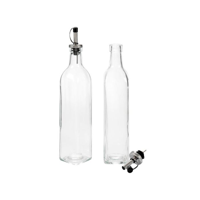 Set oliera/acetiera (2 pezzi) in vetro trasparente, ciascuna 5 × 5 × h. 30 cm e capacità 500ml, dotate di tappo in silicone e metallo per chiusura sicura e versamento controllato; design elegante e funzionale con beccuccio antigoccia, vetro resistente e facile da pulire, perfette per olio, aceto e condimenti in tavola o in cucina.