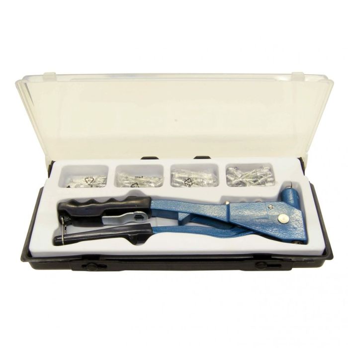 Set rivettatrice con 100 rivetti assortiti, completo di 25 rivetti per ciascun diametro (2,4 mm, 3,2 mm, 4,0 mm e 4,8 mm), fornito in pratica custodia in plastica; ideale per lavori di fissaggio, riparazioni e bricolage grazie alla versatilità delle misure incluse.